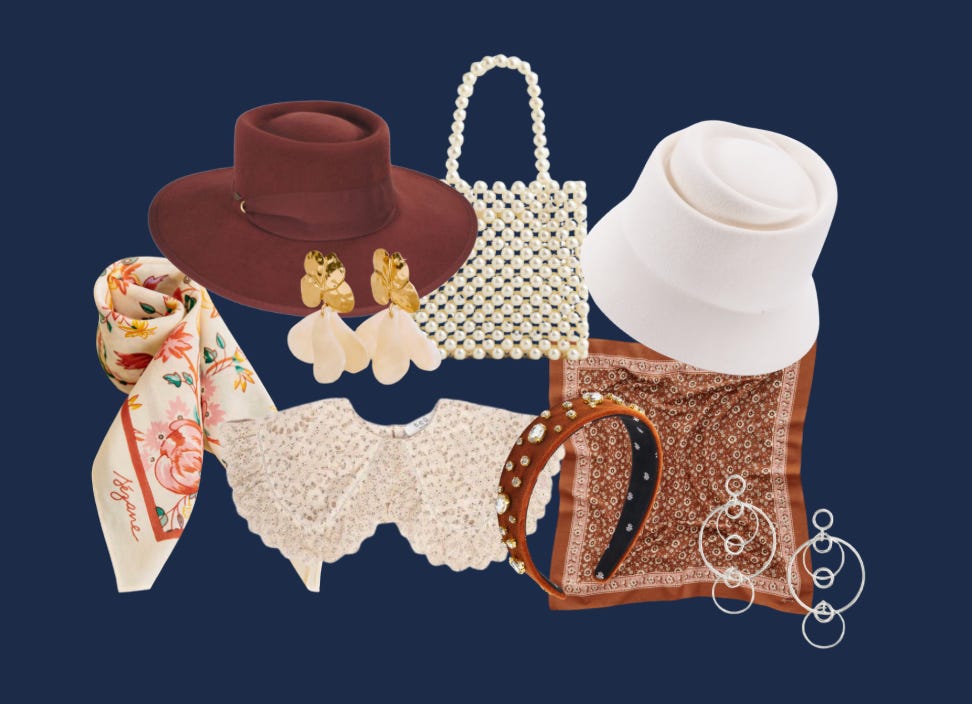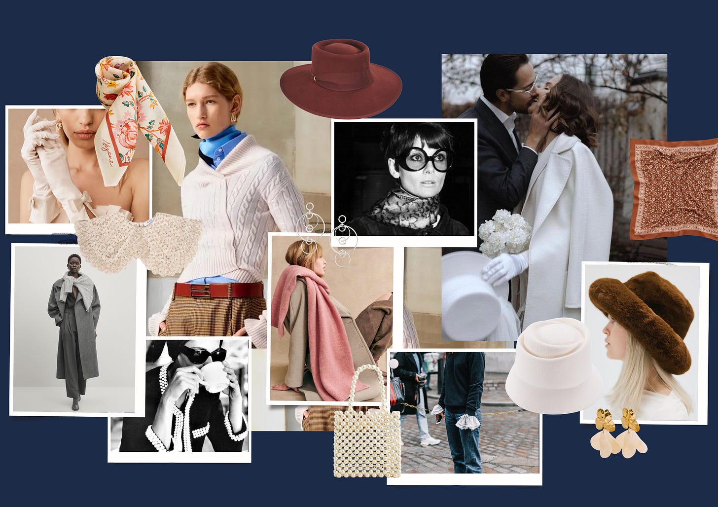 left to right: Anthro gloves, Sezane scarf, Victoria Beckham Pre-Spring Collection, hat, Audrey Hepburn, @100_layercake, Sezane scarf, Massimo Dutti, Sea New York Collar, Pinterest (Chanel), J. Crew silver earrings, Sezane scarf, J. Crew faux-pearl mini bag, Pinterest, Etsy felt hat, Sezane floral earrings, Gigi Pip faux fur hat