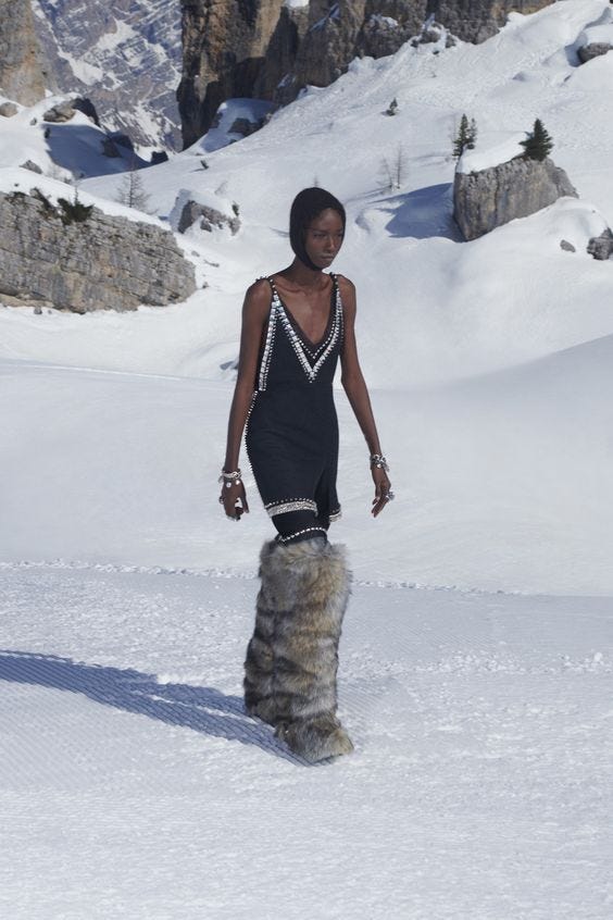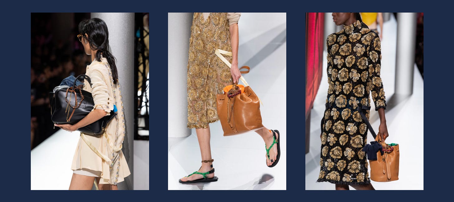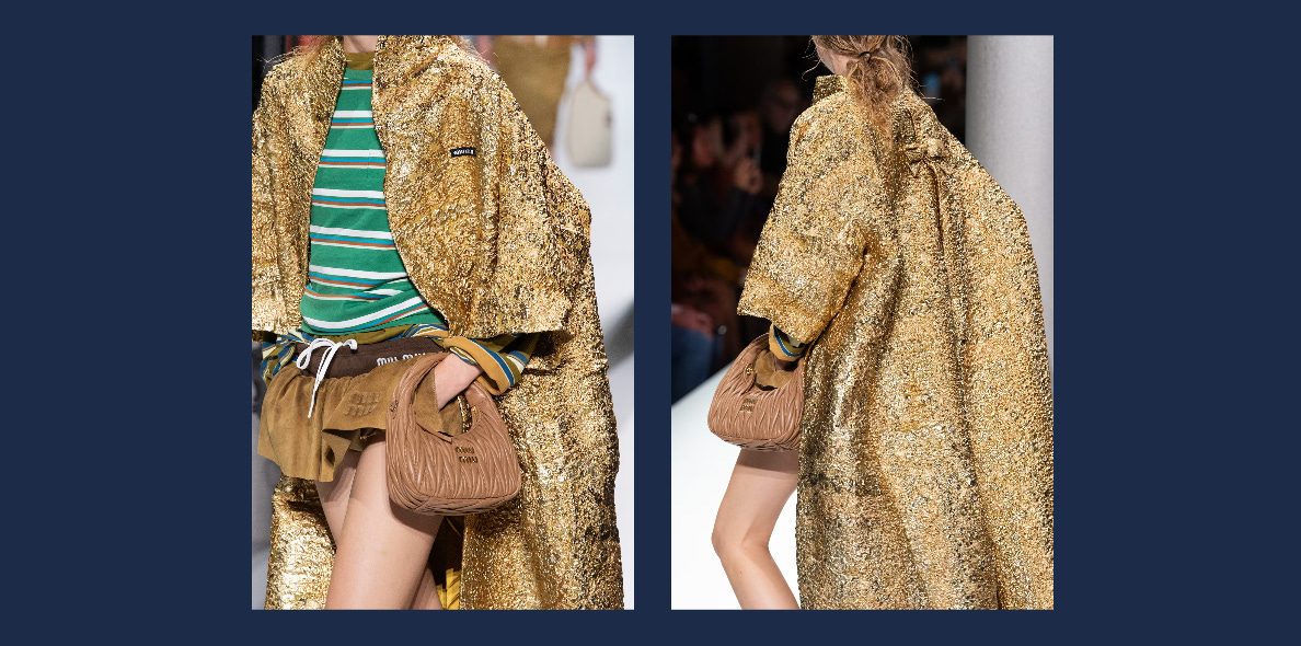 Miu Miu often nails whimsy and practicality. Spring 2024 looks were pants-less and very schoolgirl skirt gone very short. One schoolgirl look was then put with a gold coat/wrap. In one word: whimsical.